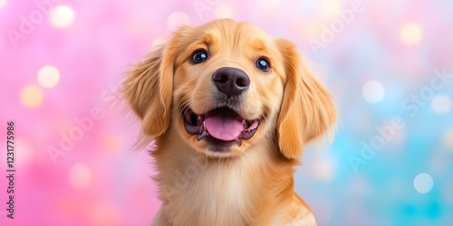 A golden retriever puppy smiling against a soft, colorful, blurred background. Concept Golden Retriever Puppy, Smiling Expression, Soft Blurred Background, Colorful Aesthetics