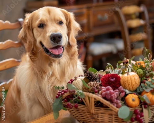 A golden retriever sits patiently, looking towards a basket of fall decorations. AI.