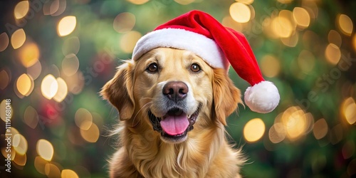 A Golden Retriever wearing a festive red and white hat, with a warm smile, against a bokeh background of twinkling lights.