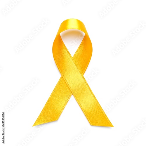 A golden ribbon, tied in a loop, against a white background