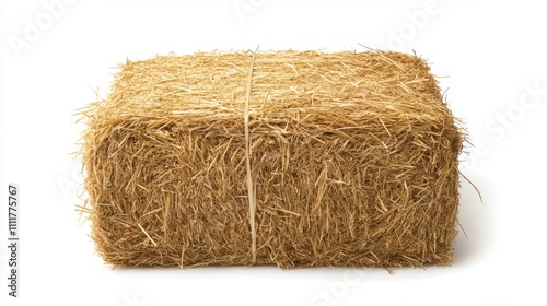 A golden square bale of straw, isolated on a minimal white backdrop, with visible binding details for realistic visuals.
