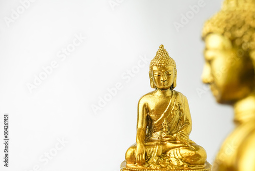 A golden statue of a Buddhist figure meditating facing the front isolated on white background. Bodhisattva Face. Concept for Vesak Day and Enlightenment Day