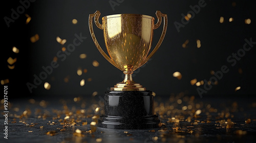 A golden trophy is centered on a dark surface as confetti cascades around it, symbolizing a moment of victory and celebration