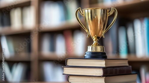A golden trophy placed on top of a stack of books, symbolizing achievement in education.
