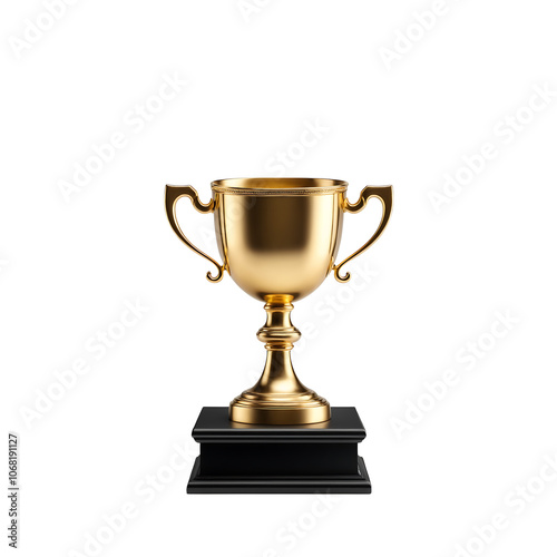A golden trophy standing shiny gold cup placed on a sleek black podium, isolated on a clean white background, in a high-resolution PNG cutout format