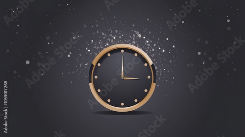 A Golden-rimmed Clock with a Black Face and Gold Hands Against a Black Background with White Specks