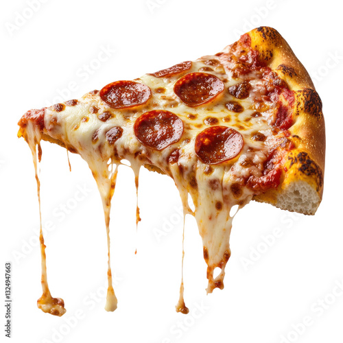 A gooey slice of pepperoni pizza with melted cheese dripping down, showcasing a crispy crust.