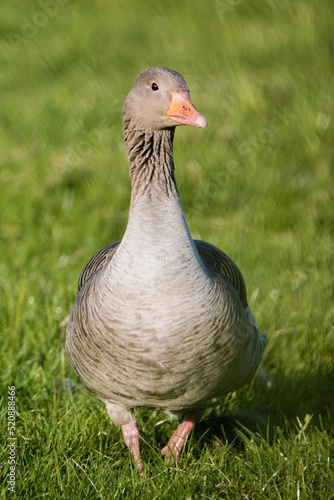 A goose taken from the front walking on a grassy green field at a goose farm in the Netherlands in the village of Kinderdijk. Orange beak. Only one eye can see.