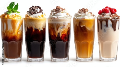 A gourmet selection of coffee drinks topped with whipped cream and chocolate accents, evoking a sense of indulgence and premium coffee craftsmanship.
