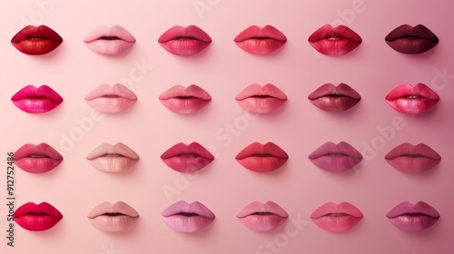 A gradient array of lips in various shades of pink and red against a soft pink background, evoking a sense of beauty and cosmetics.
