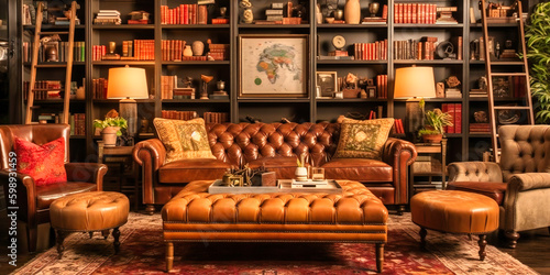 A grand bookshelf tower over a cozy seating area, filled with plush armchairs and warm textures