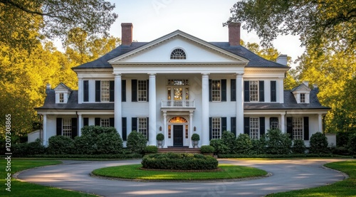 A grand, classic mansion surrounded by lush greenery and a serene path.