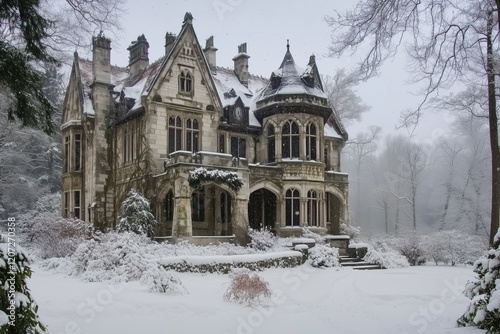 A grand, historic Gothic Revival house mansion covered in snow, surrounded by a winter landscape. The architecture features intricate details, turrets, and large windows.