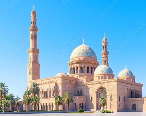 A grand mosque with intricate domes and minarets, surrounded by palm trees under a clear blue sky