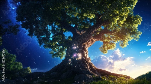 A grand oak tree with carvings of celestial bodies, stars, and moons, illuminated by soft starlight, ultra-detailed, 4K