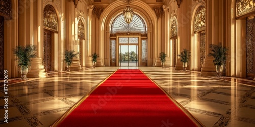 A grand room featuring a red carpet and luxurious architectural details, exuding elegance and sophistication.