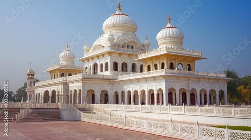 A grand Sikh gurdwara with glistening white marble domes and intricate carvings, exuding a sense of peace and spiritual grandeur