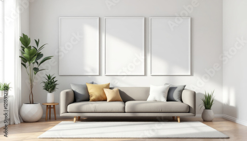 a gray sofa with three throw pillows, a white rug, and three white picture frames on the wall above the sofa. Cozy modern living room with photo frame design