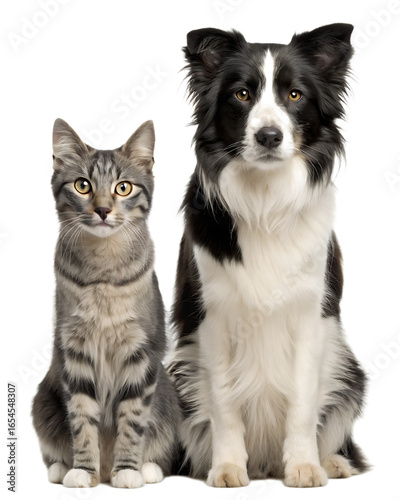 A gray tabby cat and a black and white border collie dog sitting side by side looking at the camera