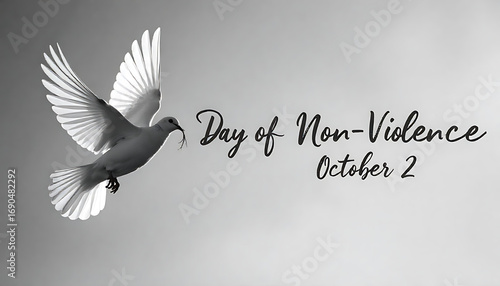 A grayscale dove in flight with the text “Day of Non-Violence October 2” on a soft gray background