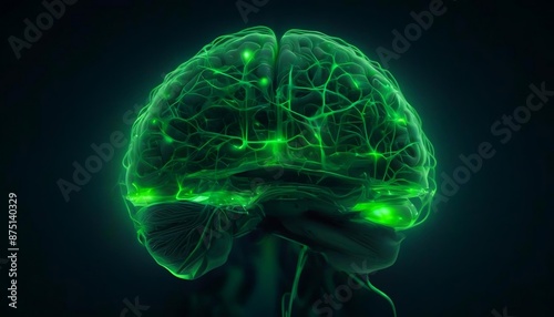 A green and black image of a brain, brain connected to computer, brain interface, neural network, artificial consciousness, banner copy space art, illustration created with generative ai.