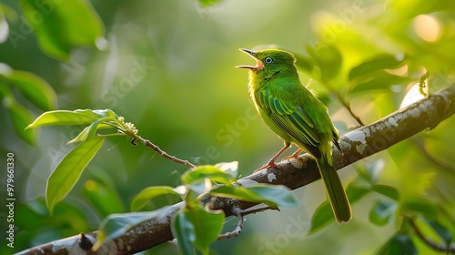 A green bird very beautiful singing the song