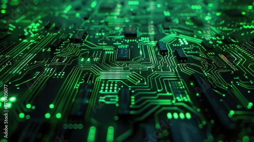 A green computer chip with many small squares. The squares are all different sizes and colors. The image is of a computer chip, but it is not a real one
