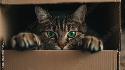 A green eyed cat feeling lonely and sad has nestled in a stack of folded shoe boxes reaching out its paws with hope and gazing intently Copy space available