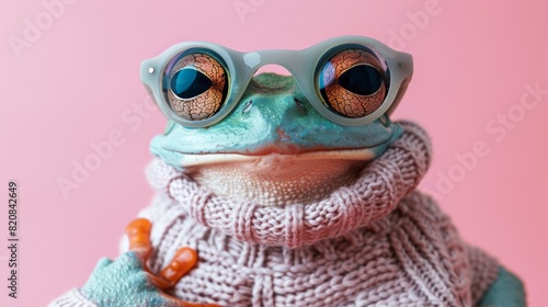 A green frog wearing glasses and a pink scarf is sitting on a pink background. The frog is looking at the camera with a serious expression.