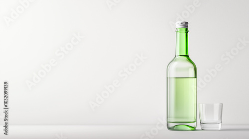 A green glass bottle filled with liquid stands next to clear glass on minimalist background, creating refreshing and clean aesthetic.