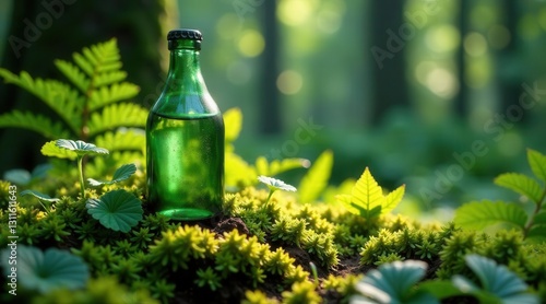 A green glass bottle rests gently amongst vibrant spring foliage, bathed in the soft sunlight filtering through a lush forest canopy.