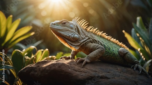 A green iguana basking on a rock with sunlight filtering through lush foliage.