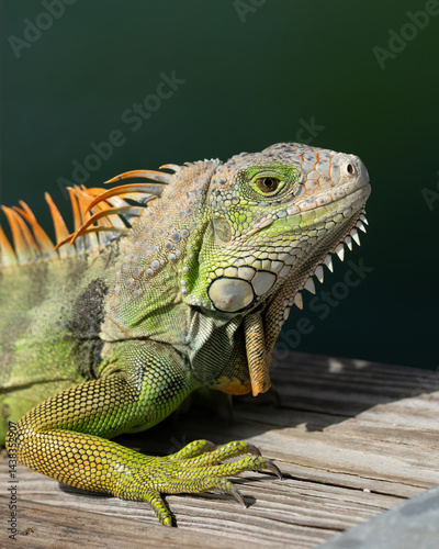 A Green Iguana (Iguana iguana) also known as American Iguana on a dock in the Florida Keys, USA.