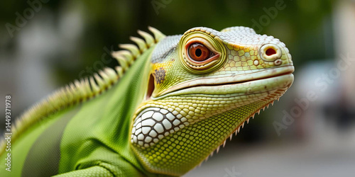 a green iguana, showcasing its detailed features. The iguana's skin is a vibrant green with patches of darker green and brown, providing a textured appearance