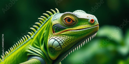a green iguana, showcasing its detailed features. The iguana's skin is a vibrant green with patches of darker green and brown, providing a textured appearance