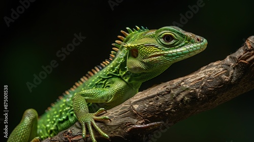 A green lizard is sitting on a branch. Generate AI image