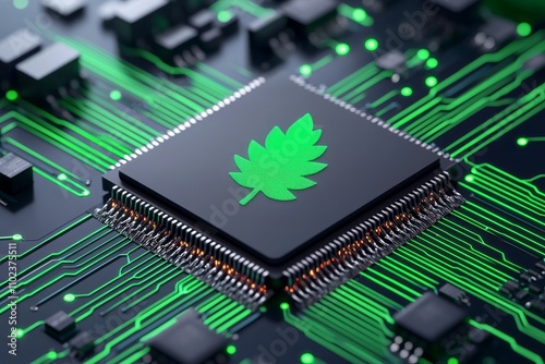 A green microchip featuring a leaf motif represents eco-friendly technology and sustainable innovation within the tech sector.