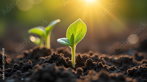 A green sprout emerges from dark soil, illuminated by soft sunlight, symbolizing growth and new beginnings in nature's vibrant cycle