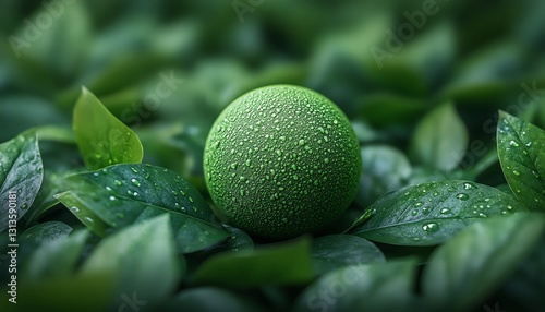 A green, textured sphere resting on a uniform green background, surrounded by vibrant leaves, symbolizing harmony and tranquility in nature
