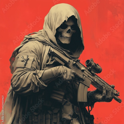 A grim reaper in a desaturated hooded cloak, holding an assault rifle, against a bold red background.