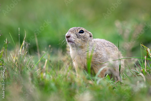 A ground squirrel peeks out of a hole in a green meadow and observes the surroundings.