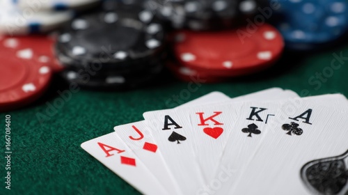 A group is engaged in an intense card game featuring a royal flush hand of four aces and a jack. Colorful poker chips are scattered across a green felt table.