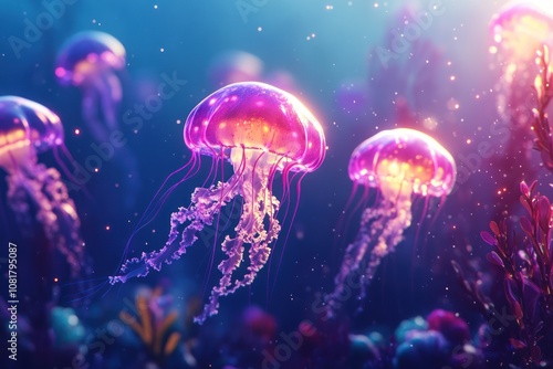 A group of bioluminescent jellyfish swim through the ocean, their translucent bodies glowing with an ethereal light.