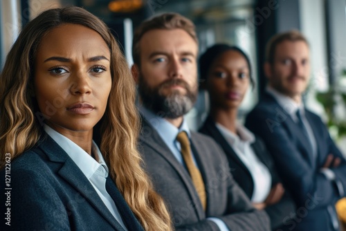 A group of business professionals standing in a row, possibly discussing or presenting something
