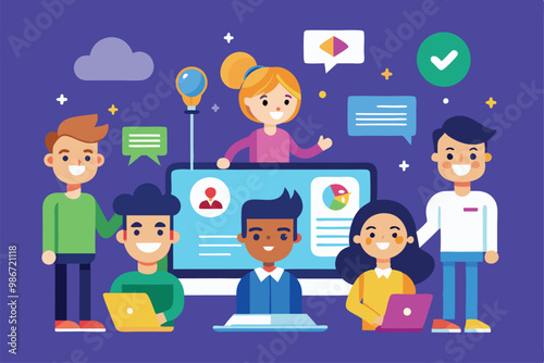 A group of cartoon characters engages in teamwork on laptops, sharing ideas and digital resources collaboratively, Customizable cartoon illustrations by the content team.