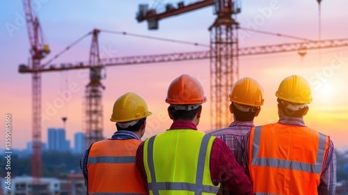 A group of construction workers in safety gear observes a building site at sunset, with cranes silhouetted against the colorful sky, Mental health in the workplace.