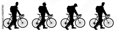 A group of cyclists with big tourist backpacks on their backs and wearing caps are looking around at something. A guy with the bike. Side view. Silhouettes of a man in black color isolated on a white