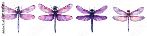 A group of delicate iridescent purple dragonflies with transparent wings in graceful aerial motion