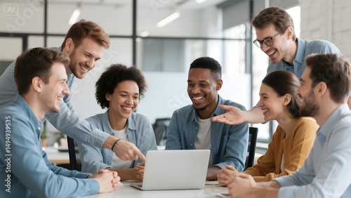 a group of diverse people meeting in a modern office, smiling and collaborating on a project, businesspeople, office environment, computer, desk, windows, bright, well-lit, warm tones