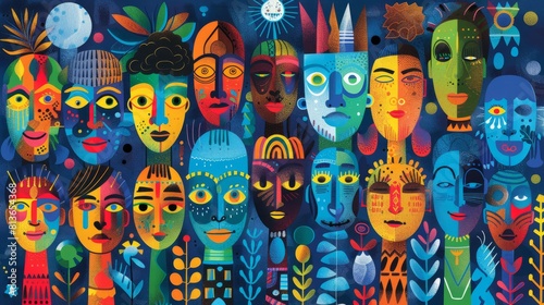 A group of diverse people with different skin colors and facial features are depicted in a colorful and abstract manner